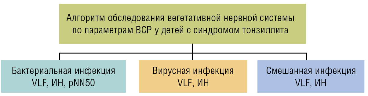 Из представленного алгоритма следует, что при инфекционном заболевании, протекающем с синдромом тонзиллита, вне зависимости от этиологии необходимо проводить оценку показателей вариабельности сердечного ритма, таких как нейрогуморальный и метаболический уровни регуляции (VLF) и индекс напряжения (ИН), а при бактериальной этиологии еще и показателя парасимпатического звена регуляции (pNN50).