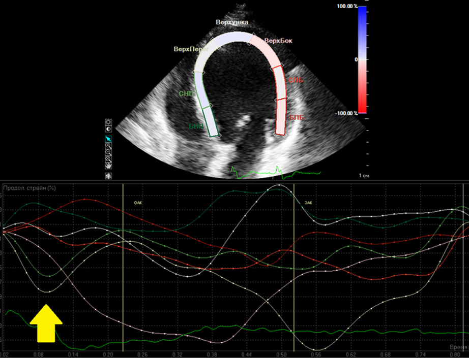Рисунок 1. Раннее пресистолическое наступление пика LS базального и среднего сегментов МЖП у пациента с наличием SF (указано стрелкой).