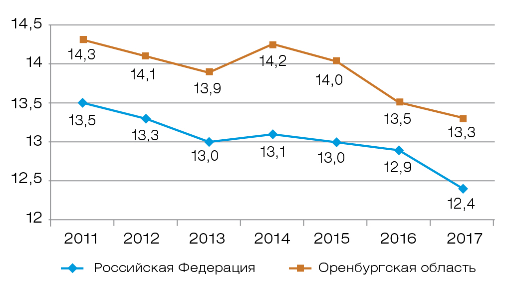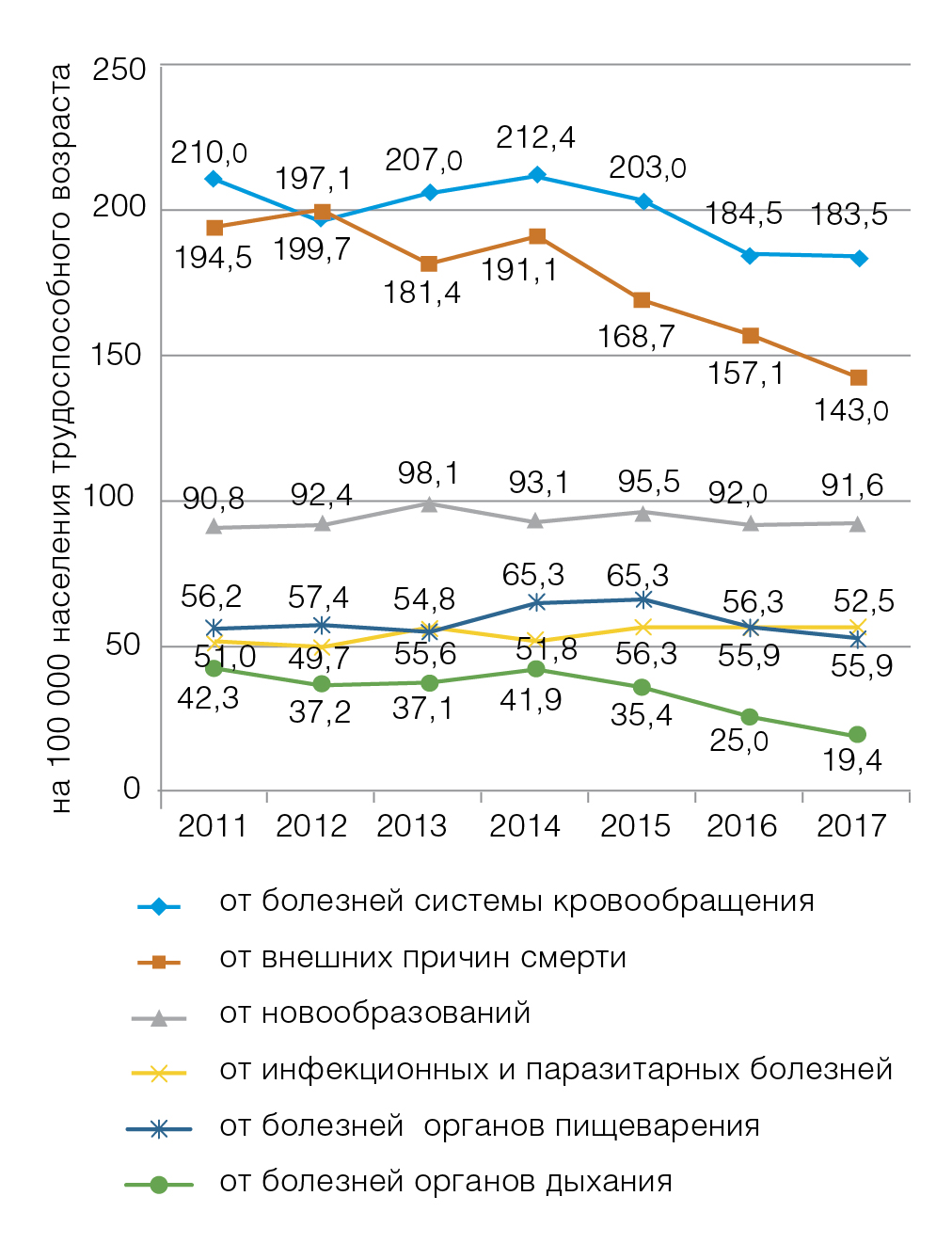 Objectives – to study the mortality indicators, their dynamics and structure, in the population of the Orenburg region in the period of 2011–2017.