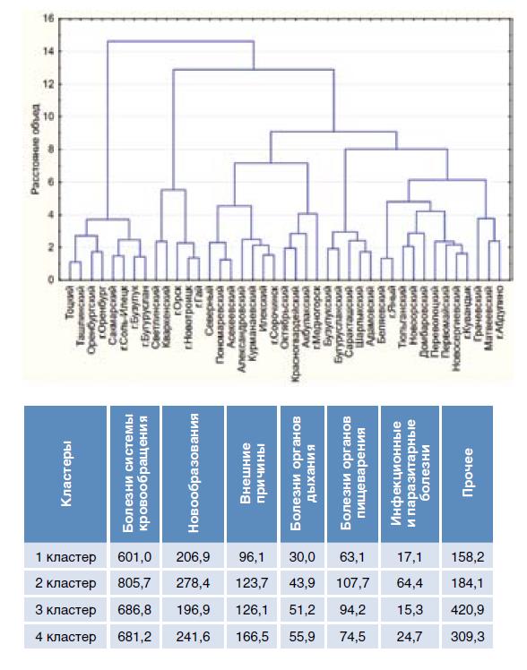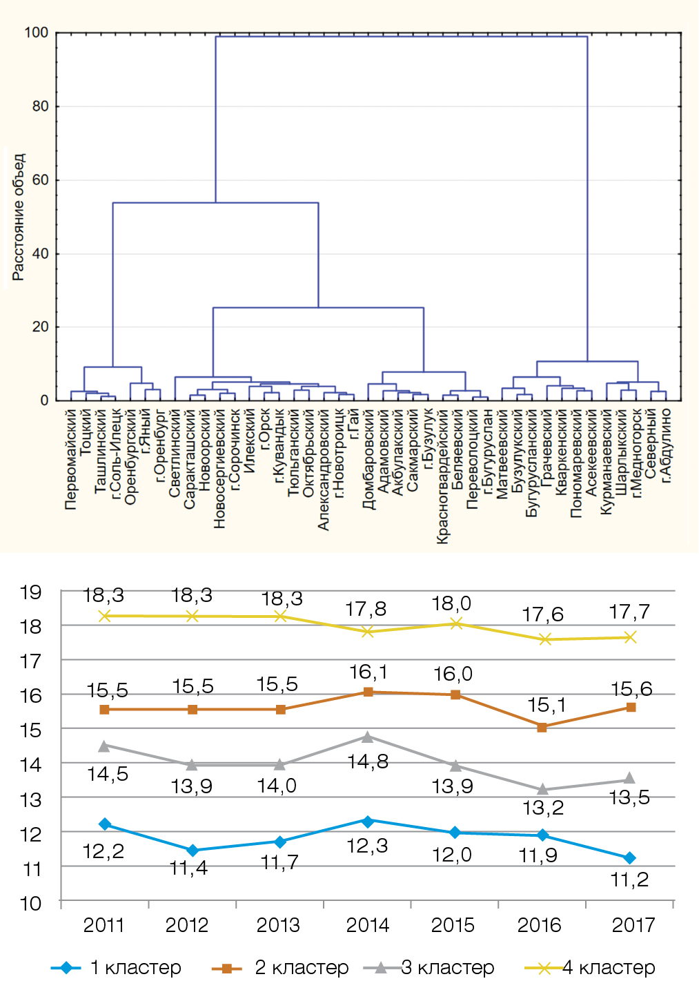 Рисунок 6. Результаты кластерного анализа муниципальных образований Оренбургской области по причинам смертности населения в 2017 г. (на 100 000 населения).