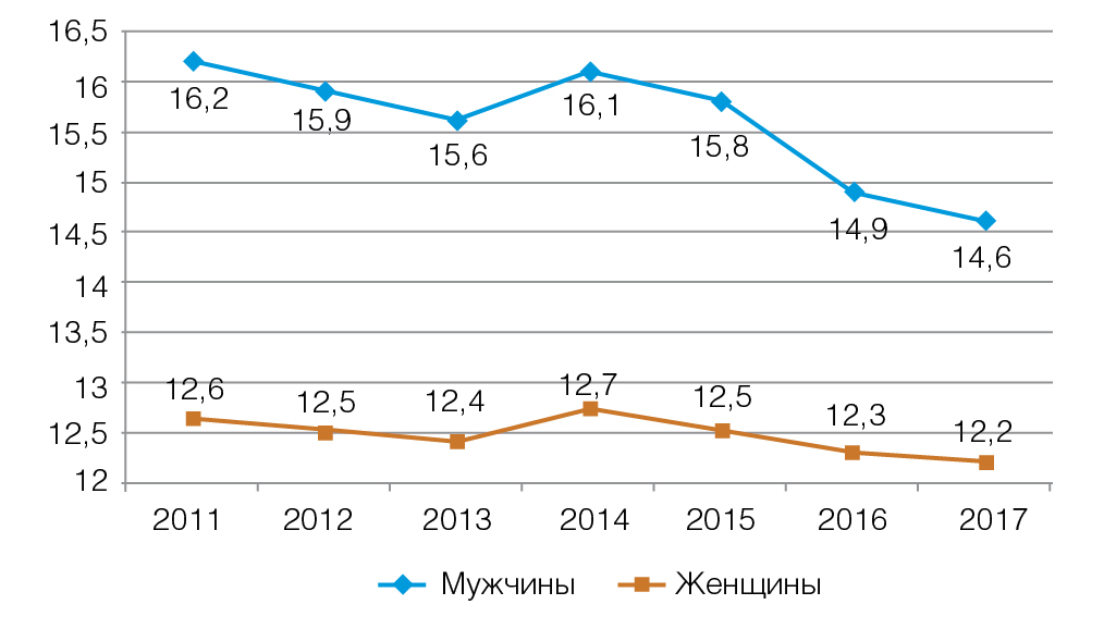 Согласно текущему исследованию, в период 2011–2017 гг. наблюдается снижение показателей смертности как среди мужского, так и среди женского населения. Следовательно, на рассматриваемый промежуток времени наблюдается изменение направленности показателя. Показатель смертности среди мужчин по-прежнему выше, чем показатель смертности женщин, но имеет выраженную тенденцию к снижению. Смертность среди мужчин преобладает во всех возрастных периодах над показателем смертности женщин более чем в два раза, начиная с 10–14 лет, заканчивая 70–74 годами, когда показатели смертности среди мужчин и женщин начинают выравниваться.