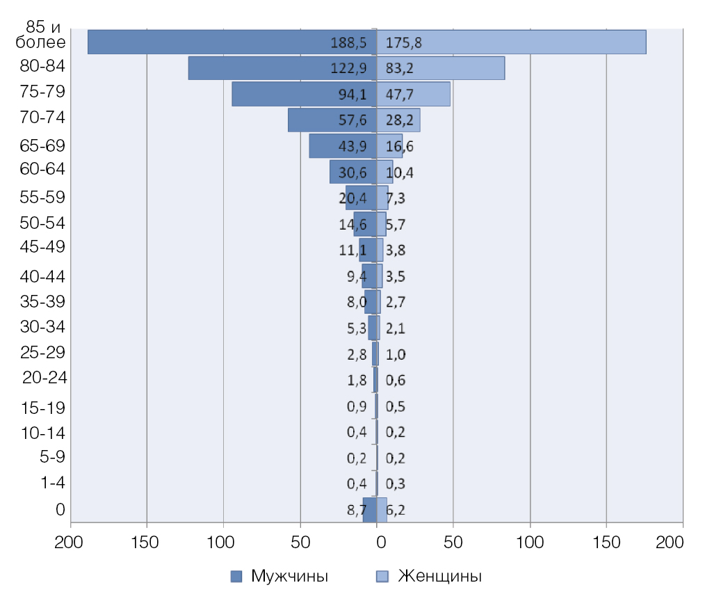 - Смертность мужчин существенно превышала смертность среди женского населения. Особенно четкая разница начинает прослеживаться начиная с возраста 35 лет.