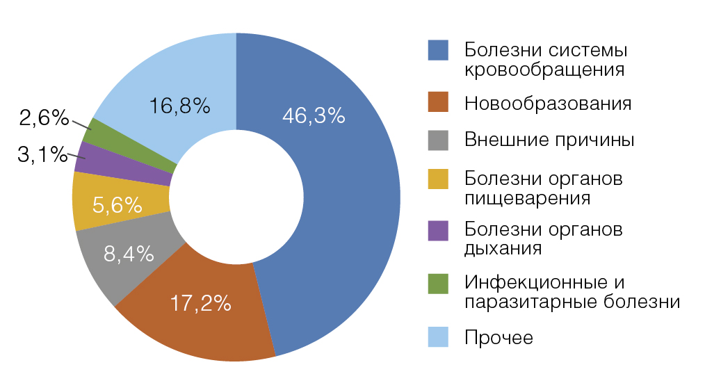 The leading position among the causes of death is taken by diseases of the circulatory system (46.3% of the total mortality). The second position is occupied by tumors (17.2%), the third – by external causes (8.4%). Mortality from circulatory system diseases and from external causes has reduced. The dynamics of mortality from tumors does not change significantly.