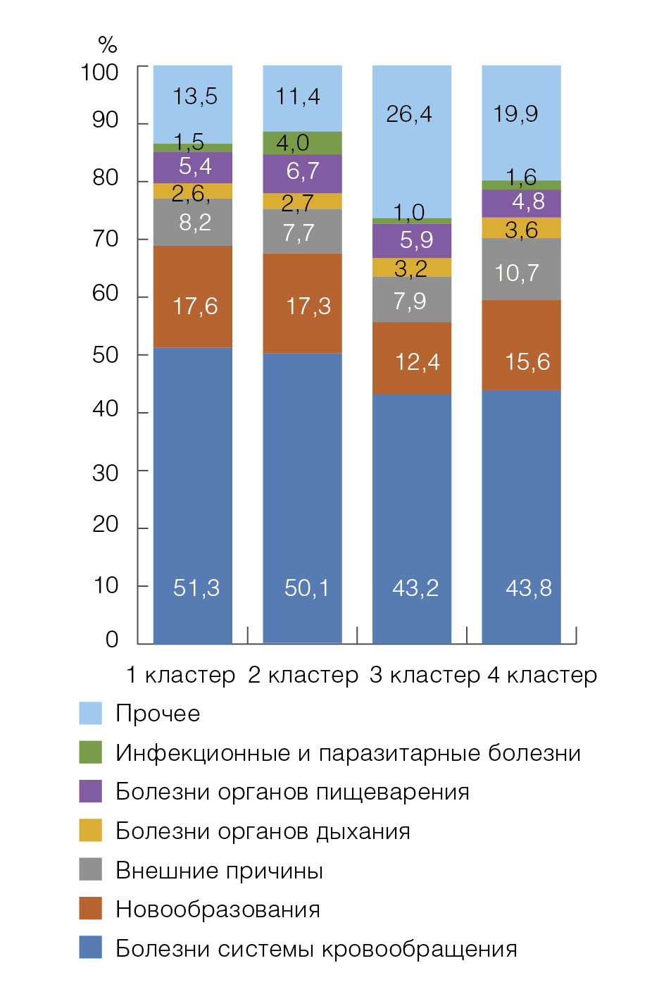 The rank of leading causes of death is not identical in the clusters: in the third and fourth clusters, the other causes occupy the second place in the structure of mortality, while tumors occupy the third.