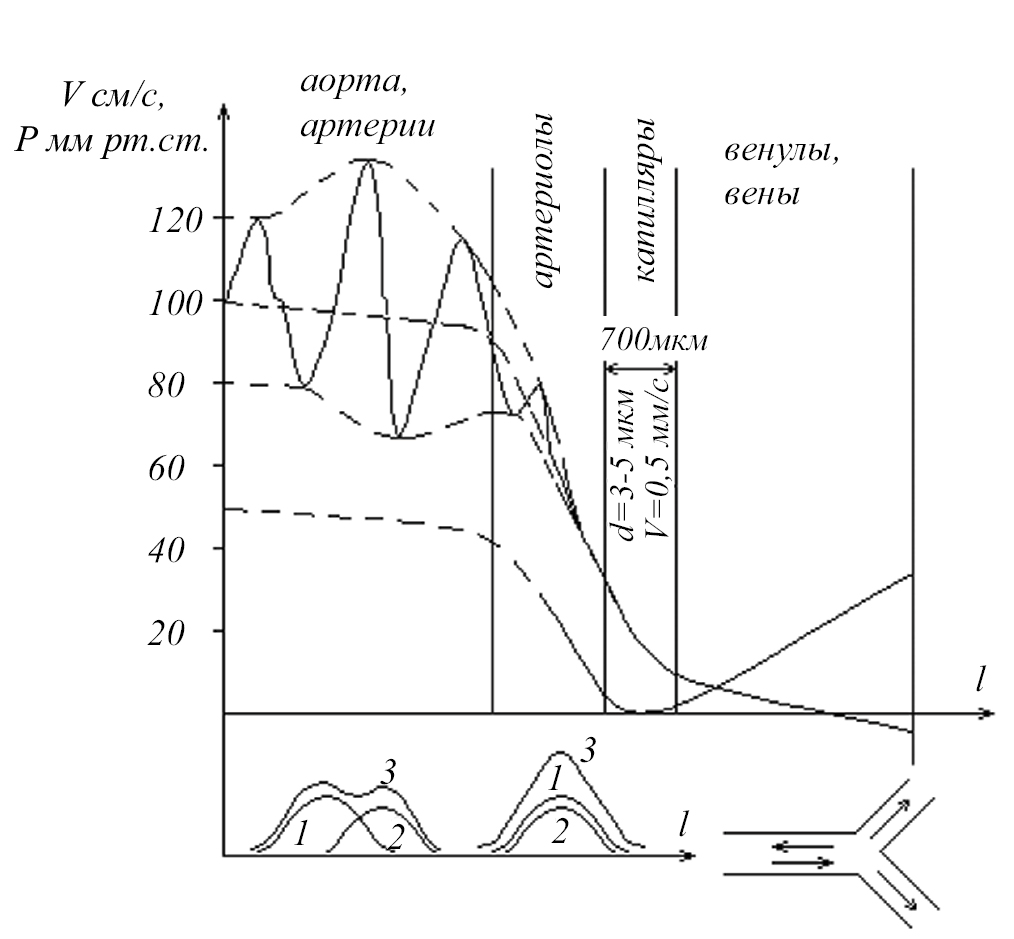 На рисунке 1 показан принципиальный ход изменения давления и скорости течения крови в сосудистой системе. На графике отмечено увеличение пульсового давления по мере движения крови по артериальным сосудам. В нижней части рисунка показана схема отражения пульсовой волны от бифуркации сосуда. Волна давления 1, образовавшаяся после выброса крови из левого желудочка сердца, подходит к бифуркации и частично отражается — волна 2. Отраженная волна 2 начинает распространяться по артерии в обратном направлении. Прямая и отраженная волны складываются. При этом вблизи бифуркации это сложение происходит в фазе и амплитуда суммарной волны 3 возрастает. Но следующая пульсовая волна складывается с отраженной волной 2 со сдвигом фаз и на суммарной волне 3 образуется инцизура, или дикротическая волна.
