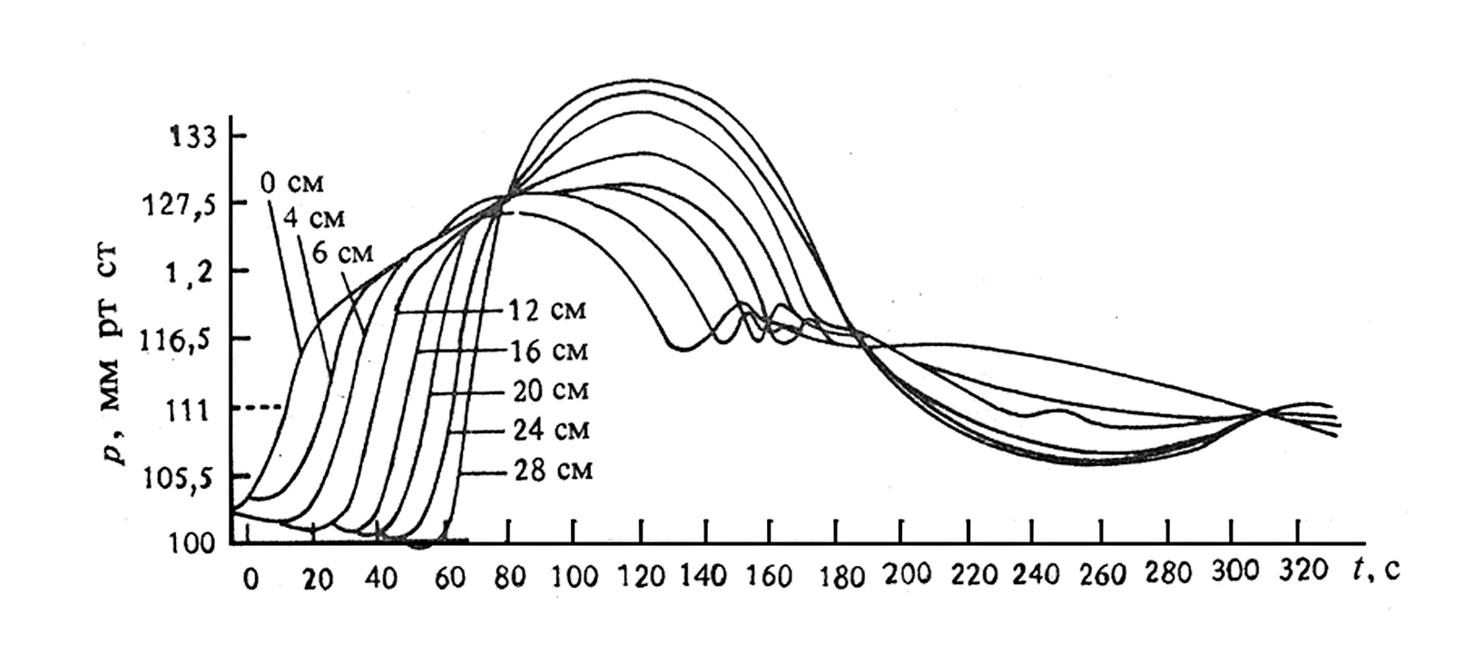 В сердечно-сосудистой системе кровеносных сосудов такой длины нет, поэтому образования ударных волн в окончательной форме в них не происходит. Однако экспериментально выявленное увеличение крутизны переднего фронта пульсовых волн в кровеносных сосудах (рисунок 2) позволяет предполагать, что тенденция к появлению ударных волн наблюдается.
