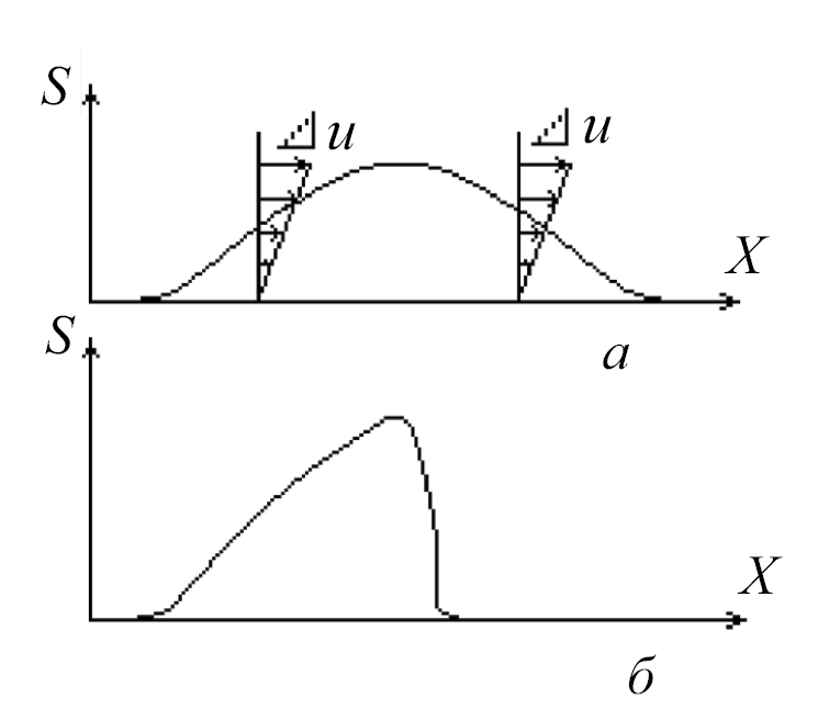 За счет большей скорости распространения волны давления в более растянутых участках сосуда (на пике волны), чем в менее растянутых (у основания волны), наблюдается тенденция к образованию ударной волны. На рисунке 3 схематично показан принцип образования ударной волны в виде графика зависимости площади сечения эластичного кровеносного сосуда S от координаты Х. Верхние сегменты волны движутся с большей на ∆u скоростью, чем нижние (рисунок 3а). Разная скорость движения сегментов в волне приводит к изменению ее формы (рисунок 3б).