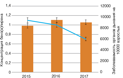 Figure 1. The correlation between the concentration of benzopyrene and respiratory diseases in the child population of Samara.