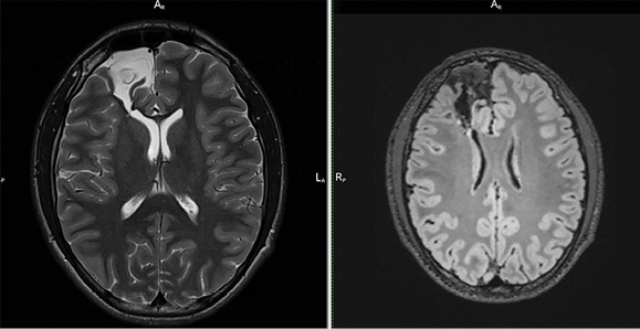 Рисунок 1. Кистозно-глиозные изменения в правой лобной доле. Слева – Т2-ВИ. Справа – FLAIR. Кистозно-глиозные изменения с отложением гемосидерина по периферии.