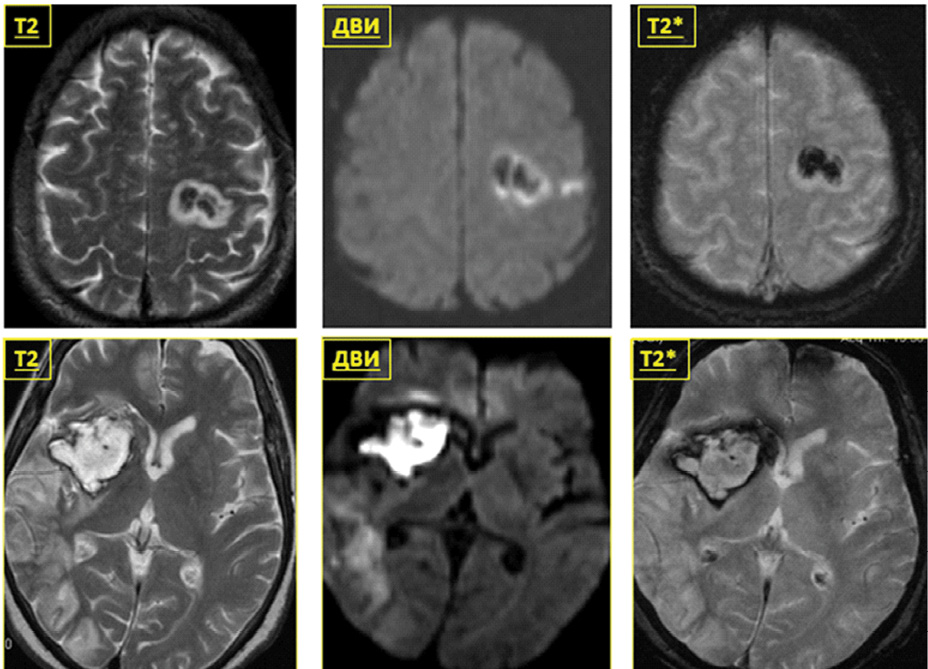 На современных МРТ используются такие импульсные последовательности, как Т2-ВИ либо SWI, которые способны визуализировать оксигемоглобин даже в минимальных количествах как включение сигнала высокой либо низкой интенсивности соответственно (рисунок 1) [6]. Однако такое программное обеспечение доступно далеко не в каждой нейрохирургической клинике, а сама программа длится не менее 3 мин.