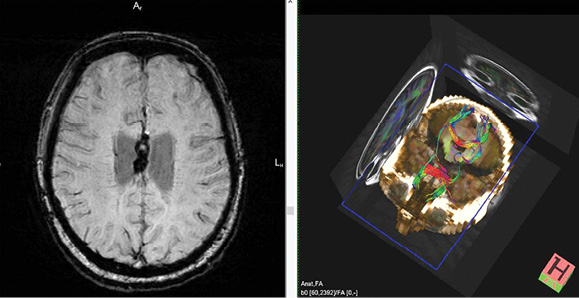 Рисунок 3. ДАП. Справа – изображения в режиме T2-ВИ. Аинтенсивный сигнал в проекции ствола мозолистого тела (отложения гемосидерина). Слева – ДТ МРТ. Разрыв комиссуральных трактов в области ствола мозолистого тела.