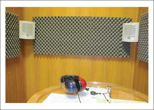 Речевая аудиометрия в свободном звуковом поле проводилась с целью оценки разборчивости речи, эффективности реабилитации после кохлеарной имплантации. Использованная приборная установка включала: клинический аудиометр AC 40 Interacoustics (Interacoustics, Дания); ноутбук HP G62 (HP, США), подключаемый к аудиометру, с записью звуковых дорожек – предъявляемого артикуляционного материала (артикуляционных таблиц); акустические излучатели – динамические громкоговорители (звуковые колонки Martin Audio F8+ (Великобритания). Аудиологический звукоизолированный кабинет продемонстрирован на рисунке 1.