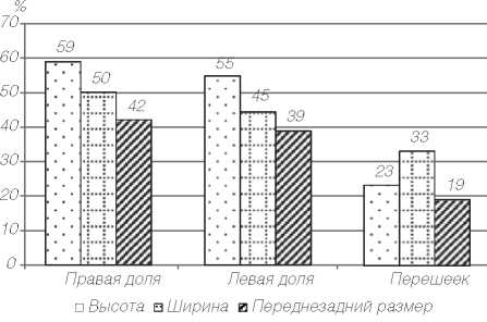 Интенсивность роста параметров левой доли от I группы ко II возрастной группе для высоты составила 23%, ширины – 20%, переднезаднего размера – 19%. От II группы к III возрастной группе интенсивность роста высоты левой доли составила 32%, ширины – 26%, переднезаднего размера – 22%.