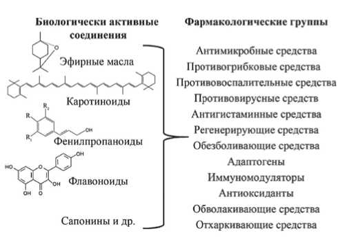 Результаты. Наибольший интерес для оториноларингологической практики представляют лекарственные растения, содержащие в качестве биологически активных соединений фенилпропаноиды, флавоноиды, эуглобали, терпеноидные и фенольные компоненты эфирных масел, сапонины, каротиноиды, алкалоиды и полисахариды. Сочетание вышеперечисленных химических групп действующих веществ обеспечивает проявление антимикробных, противогрибковых, противовирусных, противовоспалительных, регенерирующих, антигистаминных, адаптогенных и иммуномодулирующих свойств.