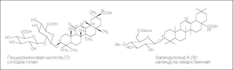 Одной из современных тенденций в фитотерапии является использование цветков календулы лекарственной в качестве компонента в составе комбинированных препаратов, в том числе лекарственных сборов [1, 5]. Одним из наглядных примеров является препарат «Грудной сбор №4», содержащий флавоноиды (рисунок 4) и сапонины (7) (рисунок 5), а также каротиноиды, которые в совокупности обусловливают противовоспалительные, отхаркивающие и регенерирующие свойства. Среди сапонинов особый интерес представляет глицирризиновая кислота (8) (рисунок 5), содержащаяся в корнях солодки и обладающая наряду с отхаркивающими свойствами еще целым рядом эффектов – противовирусным, противовоспалительным и антигистаминным действием. Отхаркивающими и обволакивающими свойствами обладают также полисахариды, содержащиеся во многих растениях, причем среди них с точки зрения лечения лор-заболеваний наиболее перспективным является подорожник большой (Plantago major L.), в листьях которого наряду с полисахаридами содержится фенилпропаноид плантамайозид, обусловливающий антибактериальные свойства [5, 28].