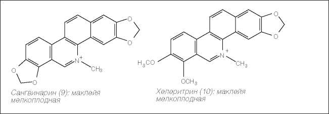 В лор-практике актуален препарат «Сангвиритрин» [5], представляющий смесь двух алкалоидов – сангвинарина (9) и хелеритрина (10) (рисунок 6). Они обладают выраженными антибактериальными и противогрибковыми свойствами. В этой связи представляется перспективным создание препаратов на основе травы чистотела большого (Chelidonium majus L., содержащей, как и трава маклейи, сангвинарин и хелеритрин [2, 5].