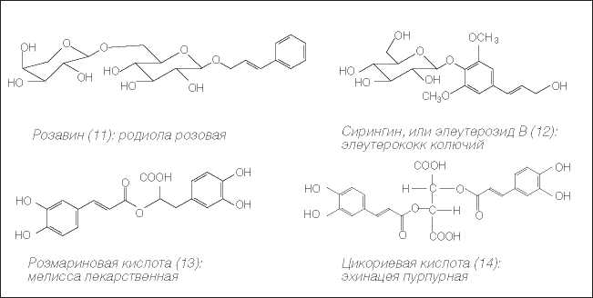 С точки зрения профилактики, лечения лор-заболеваний, а также реабилитации пациентов особый интерес представляют лекарственные растения, содержащие фенилпропаноиды (11–14) (рисунок 7). В этом отношении особый интерес представляют фенилпропаноиды родиолы розовой (розавин), элеутерококка колючего (сирингин), обладающие адаптогенным действием, а также мелиссы лекарственной (розмариновая кислота) и эхинацеи пурпурной (цикориевая кислота) (рисунок 7), для которых характерны иммуномодулирующие, противовирусные, антигистаминные свойства [5].