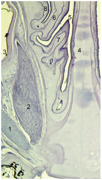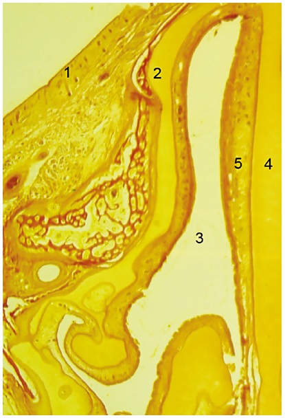Figure 1. Fetal nasal cavity: 1 – skin, 2 – cartilage of the nasal skeleton, 3 – nasal cavity, 4 – nasal septum, 5 – nasal septum mucosa.