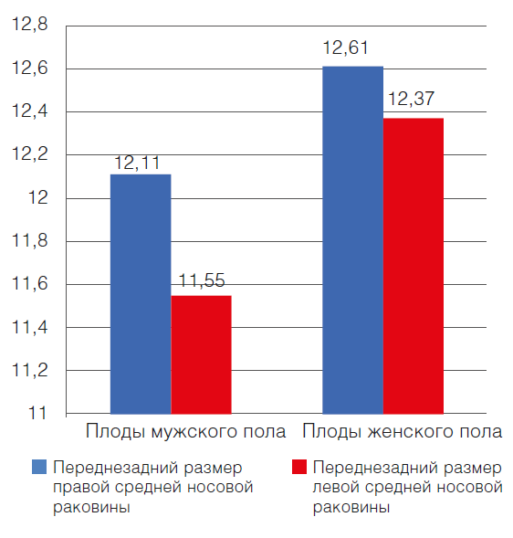 Таким образом, у плодов женского пола переднезадний размер правой и левой средних носовых раковин больше, чем у плодов мужского пола.