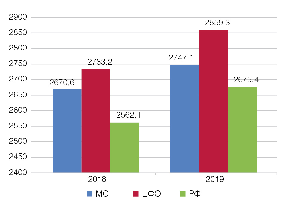 Рисунок 1. Показатели распространенности ЗНО у населения Московской области, Центрального федерального округа и России за 2018-2019 гг. (на 100 тыс. населения). / Figure 1. Indicators of the prevalence of malignant neoplasms in the population of the Moscow region, the Central Federal District and Russia for 2018-2019 (per 100 thousand people).