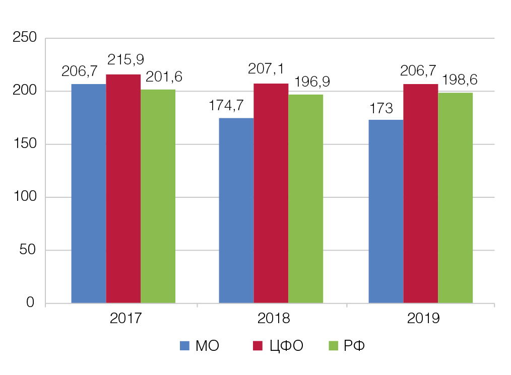 В результате целенаправленно проводимой работы первичного звена здравоохранения по диспансеризации населения, раннему выявлению онкопатологии уровень смертности от ЗНО в Московской области снизился в 2019 году до 173,0 случая на 100 тыс. населения, что на 16,3% и 12,9% соответственно ниже аналогичных значений по Центральному федеральному округу – 206,7 и России в целом – 198,6 случая (рисунок 2).