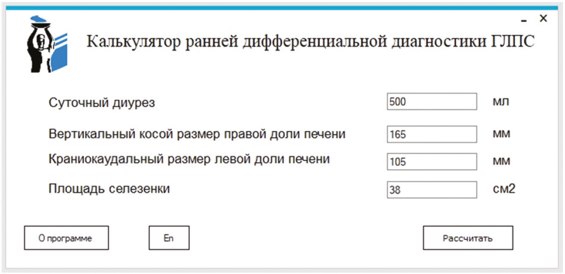 Рисунок 1. Стартовое окно программы «Калькулятор ранней дифференциальной диагностики ГЛПС» с введенными в текстовые поля данными из примера 1.