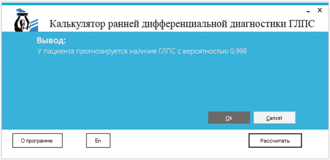Рисунок 2. Окно калькулятора с количественным вероятностным выводом о наличии ГЛПС у пациента с показателями из примера 1.