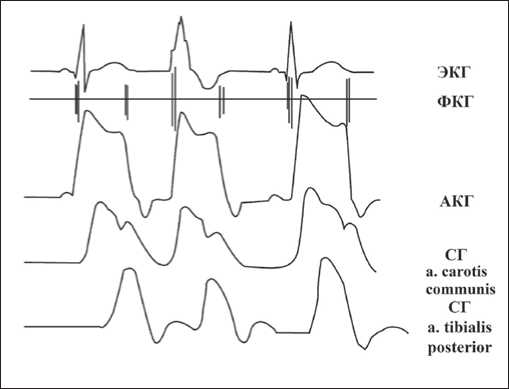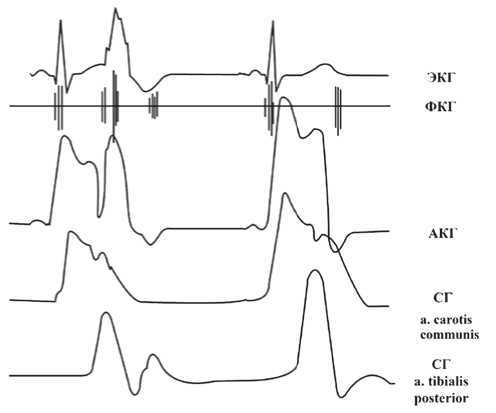 Мы провели совместный анализ ЭКГ, ФКГ, ЭхоКГ, УЗДГ БЦС, АКГ и СГ, а также проводили измерение АД прямым методом или по методу Короткова. По ЭКГ мы уточняли локализацию эктопического очага ЭС. По ФКГ определяли момент систолы и диастолы желудочков. По ЭхоКГ – пик трансмитрального кровотока. По УЗДГ БЦС и задней артерии голени анализировали линейную скорость кровотока (ЛСК), объемный кровоток. По АКГ – момент открытия митрального клапана. При СГ и АКГ определялись наиболее информативные показатели биомеханики сердца и кинетики артерий: скорость, ускорение, мощность, работа.
