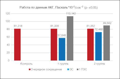 Рисунок 3. Изменение основного показателя – работы (р<0,05) – по данным АКГ у пациентов 1, 2 групп в сравнении с показателями у контрольной группы.