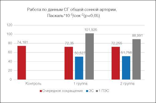 Рисунок 4. Изменение основного показателя – работы (р<0,05) – по данным СГ общей сонной артерии у пациентов 1, 2 групп в сравнении с показателями у контрольной группы.