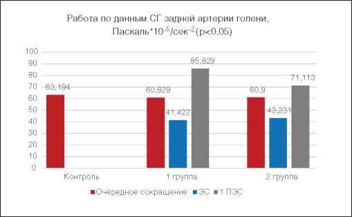 Рисунок 5. Изменение основного показателя – работы (р<0,05) – по данным СГ задней артерии голени у пациентов 1, 2 групп в сравнении с показателями у контрольной группы.