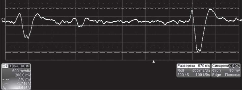Рисунок 8. Колебание давления внутри трубки при поздней ЭС (данные осциллоскопа, полученные с внутрисосудистого датчика давления).