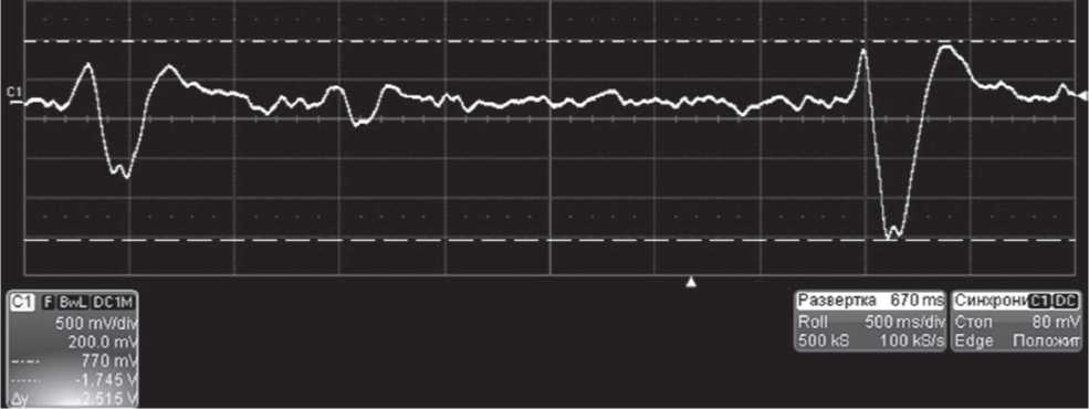 Рисунок 7. Колебание давления внутри трубки при ранней ЭС (данные осциллоскопа, полученные с внутрисосудистого датчика давления).