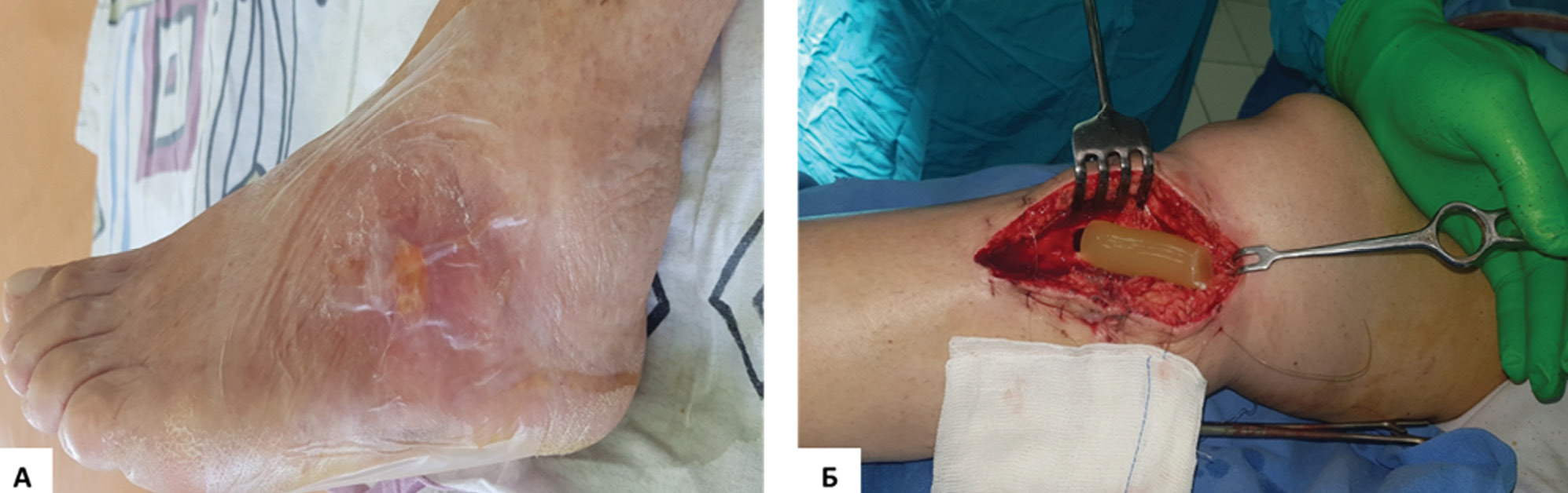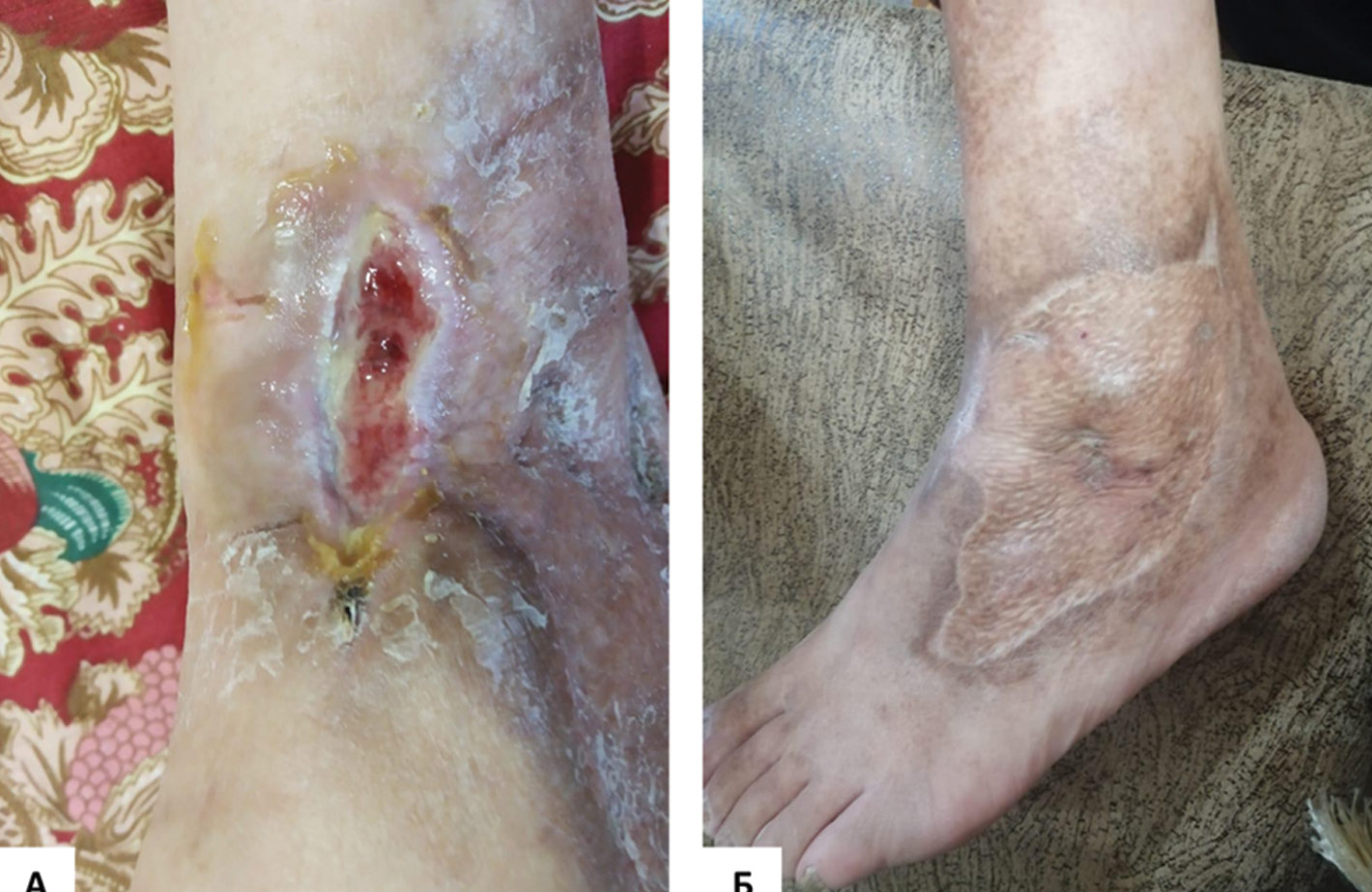 Рисунок 2. Пациент, муж., 49 лет. Мультифокальный атеросклероз. Стеноз артерий левой нижней конечности. Стеноз глубокой бедренной артерии, окклюзия передней большеберцовой артерии на правой нижней конечности. Состояние после транслюминальной баллонной ангиопластики поверхностной бедренной артерии левой нижней конечности. Сахарный диабет, 2 тип. Сопутствующие заболевания: гипертоническая болезнь III ст., риск 4. Трофическая язва. Ранее была выполнена аутодермопластика. Рецидив язвы. А) До лечения ОбТП в виде аппликаций и инъекций лизата тромбоцитов. Б) После лечения. Полное заживление. Наблюдение в течение 2 лет. / Figure 2. Patient, male, 49 years old. Multifocal atherosclerosis. Stenosis of the arteries of the left lower extremity. Deep femoral artery stenosis, occlusion of the anterior tibial artery on the right lower limb. Transluminal balloon angioplasty of the superficial femoral artery of the left lower extremity. Diabetes mellitus, type 2. Hypertension, stage III, risk 4. Trophic ulcer. Autodermoplasty was previously performed. Recurrence of the ulcer. A) Before treatment with platelet-rich plasma in the form of applications and injections of platelet lysate. B) After treatment. Complete healing. Follow-up for 2 years.