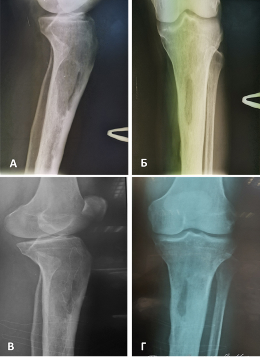 Рисунок 4. Пациент, муж., 60 лет. Хронический посттравматический остеомиелит верхней трети левой большеберцовой кости, свищевая форма. Сопутствующие заболевания: Гипертоническая болезнь II ст., риск 3. Ожирение I ст. по ВОЗ (ИМТ 30 кг/кв.м). Выполнена фистулсеквестрнекрэктомия верхней трети левой большеберцовой кости с последующей хирургической обработкой, замещением костной полости кости тромбогелем. А–Б) Рентгеновские снимки в двух проекциях до начала лечения. В–Г) Рентгеновские снимки в двух проекциях через 2,5 месяца – положительная динамика. / Figure 4. Patient, male, 60 years old. Chronic post-traumatic osteomyelitis of the upper third of the left tibia, fistulous form. Concomitant diseases: Hypertension II stage, Risk 3. Obesity grade 1 according to WHO (BMI 30 kg / sq.m). Fistula-sequester-necrectomy of the upper third of the left tibia was performed, followed by surgical treatment, replacement of the bone cavity with platelet gel. A-B) X-rays in two projections before the start of treatment. C-D) X-rays in two projections after 2.5 months – positive dynamics.