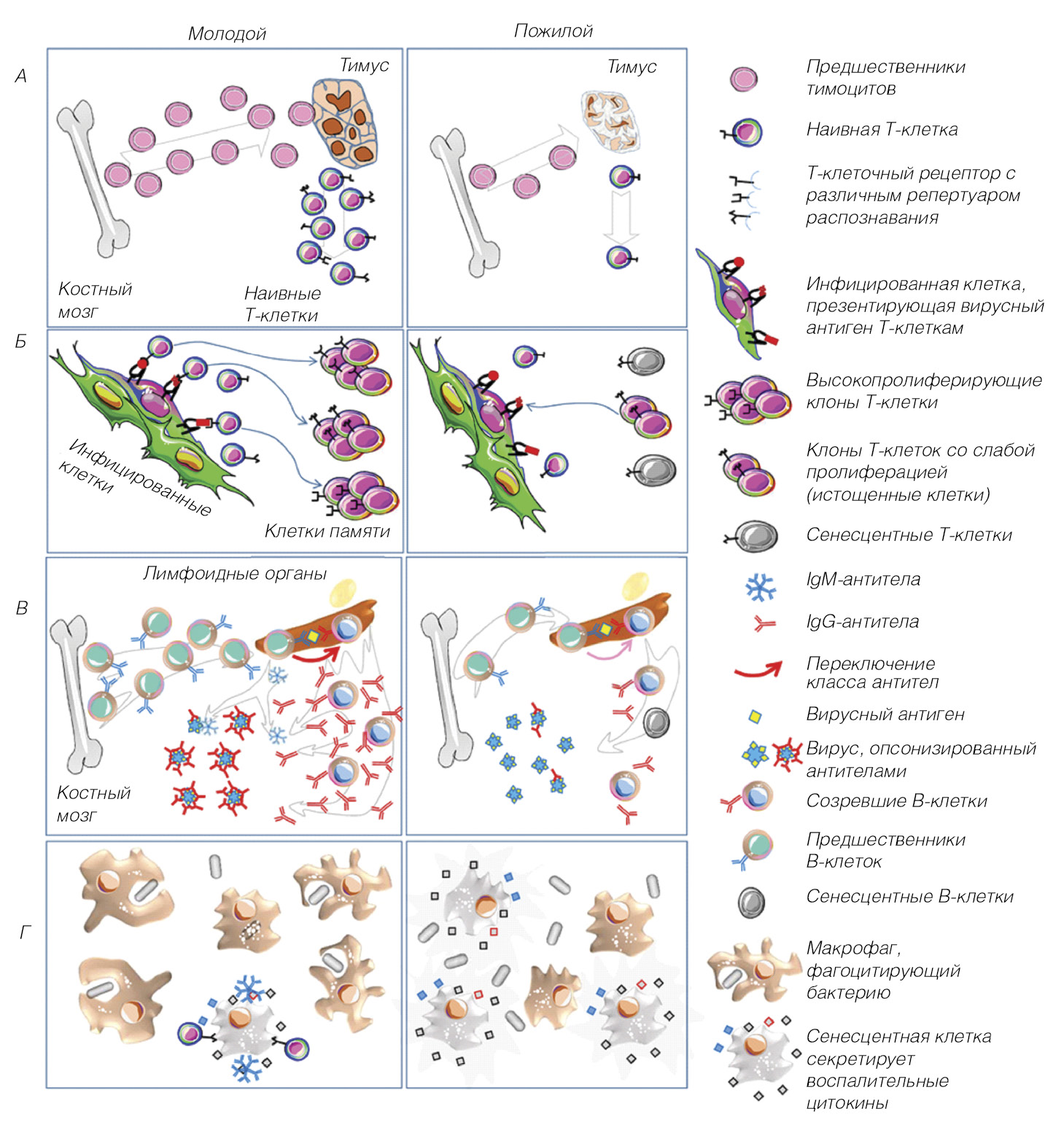 Г. В молодом возрасте присутствует большое количество фагоцитирующих клеток, удалявших клеточный мусор, бактериальные инфекции, а также стрессированные, поврежденные, мутировавшие и стареющие клетки. Поддерживается высокая вероятность апоптоза клеток после повреждения. В пожилом возрасте эффективность фагоцитоза снижается, происходит накопление стареющих клеток и клеточного мусора. Сенесцентные клетки приобретают SASP (находятся в воспаленном состоянии и секретируют воспалительные факторы). Воспалительная реакция сенесцентных клеток становится хронической, при инфекции переходит в «цитокиновый шторм». Стареющие клетки оказывают негативное воздействие на окружающие ткани. В молодом организме иммунные клетки (Т-хелперы, натуральные киллеры, В-клетки, моноциты и дендритные клетки) способны быстро и со значительной амплитудой секретировать воспалительные факторы в ответ на инфекцию. Молодые иммунные клетки также способны быстро гасить производство воспалительных факторов сразу после удаления инфекции. У пожилых присутствует много пролиферативно-истощенных клеток, неспособных к адекватной секреции цитокинов в ответ на стимуляцию антигеном. В молодом возрасте присутствует богатый репертуар минорных высокоспециализированных иммунных клеток, но с возрастом их количество и разнообразие сокращаются [90].