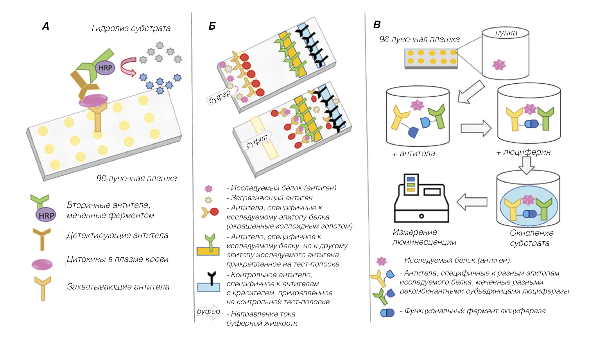 3. Figure 2. Conventional analytic methods of concentration and structure of proteins and/or metabolites. A. Enzyme immunoassay. B. Immunochromatic-graphical analysis. C. The method of bioluminescent protein-fragment complementation assay.