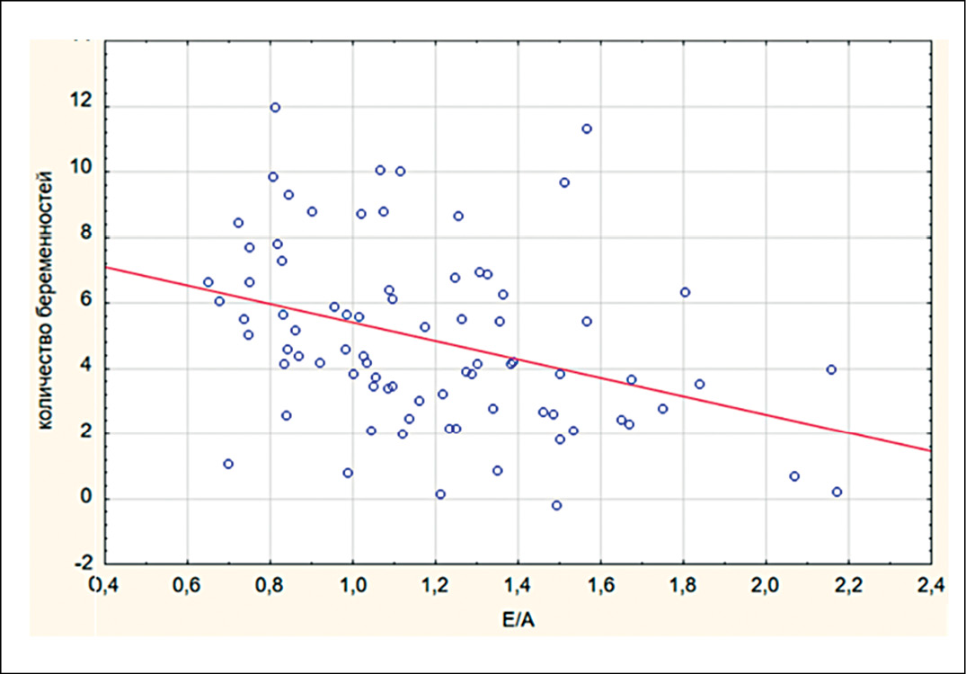 В нашем исследовании была выявлена взаимосвязь между количеством беременностей и абортов в анамнезе и наличием диастолической дисфункции, что подтверждено наличием корреляционной связи между показателями диастолической функции левого желудочка и количеством беременностей и абортов. Известно, что повышенный уровень прогестерона активирует процессы фосфорилирования в кардиомиоцитах, что ведет к синтезу более жесткой изоформы белка титина и вызывает гипертрофию миокарда во время беременности [16]. По данным исследования 710 женщин, направленных на ЭхоКГ по клиническим показаниям, установлено, что возраст, ИМТ, курение и количество родов являлись независимыми предикторами развития диастолической дисфункции в среднем через 10 лет после последних родов [17]. Однако данное исследование может не полностью отражать здоровую популяцию женщин. Исследователи полагают, что факторы, присущие ремоделированию миокарда или артерий при повторных беременностях, могут предрасполагать к будущей диастолической дисфункции. Однако точные патофизиологические механизмы, связывающие беременность и диастолическую дисфункцию, до конца не ясны.
