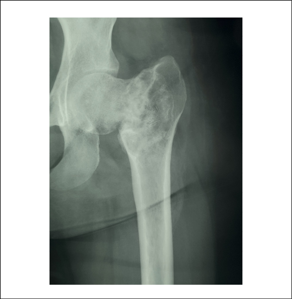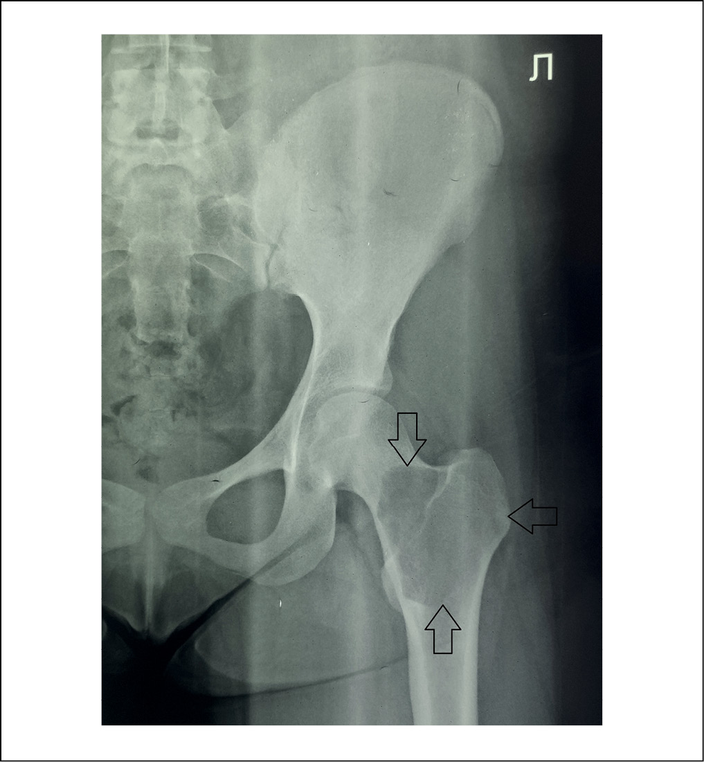 Пациентка K., 2000 г. p., в декабре 2017 года обратилась за консультацией в Клиники Самарского государственного медицинского университета по поводу случайно выявленного в ходе рентгенографии патологического образования проксимального отдела левой бедренной кости (рисунок 1).