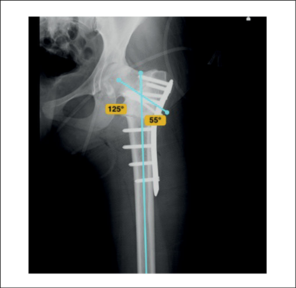 Пациентка госпитализирована в отделение травматологии и ортопедии №1 Клиник СамГМУ в плановом порядке на оперативное лечение. В качестве варианта оперативного вмешательства рассматривались остеотомия проксимального отдела бедренной кости и коррекция деформации в аппарате внешней фиксации, от чего пациентка отказалась. В качестве альтернативного варианта оперативного лечения выбрана деваризирующая корригирующая полуоткрытая-полузакрытая межвертельная остеотомия проксимального отдела левой бедренной кости с фиксацией пластиной и винтами. В результате оперативного вмешательства достигнуты стабильный остеосинтез, коррекция ШДУ до 125°, а также коррекция дефицита длины конечности до 1,0 см (рисунок 5).