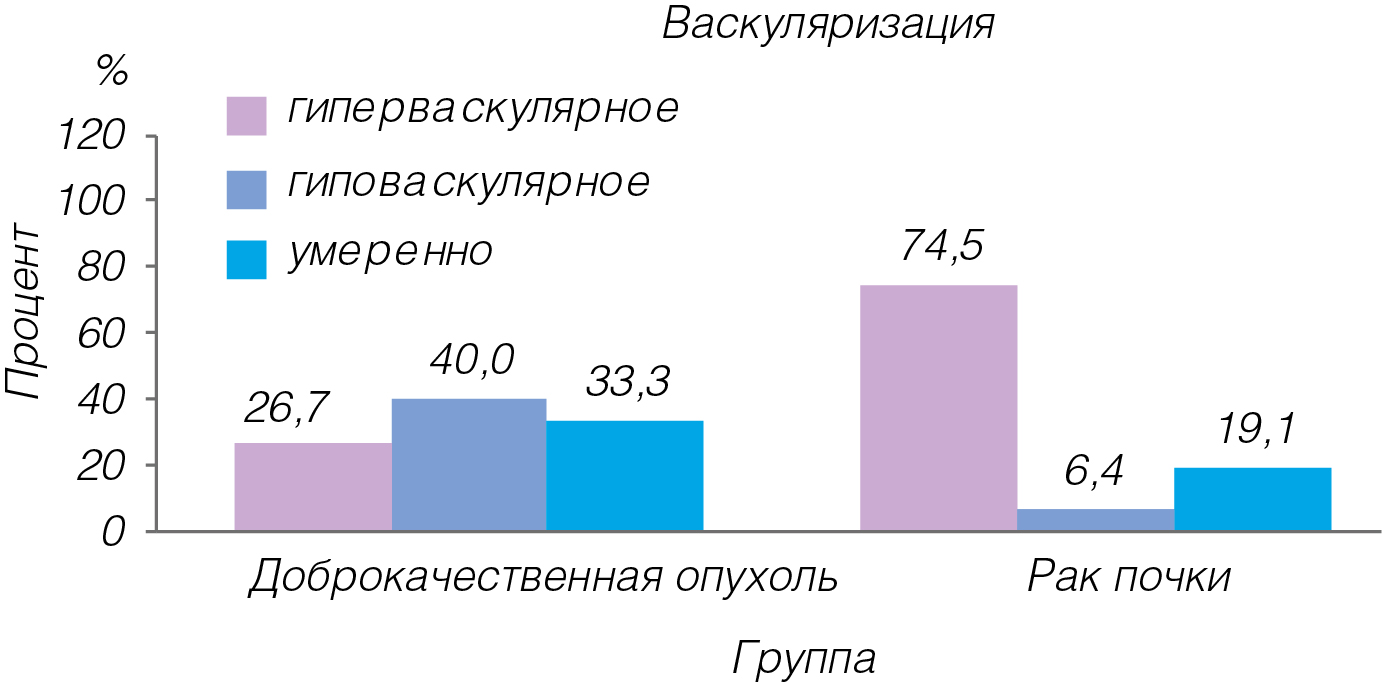 Анализ сравнения результатов КТ показал, что единственный показатель, по которому различаются группы, – это результаты васкуляризации. В группе пациентов с раком почки гораздо чаще диагностировали гиперваскулярное образование, чем в группе с доброкачественными опухолями – 69,5% и 26,7% соответственно (рисунок 1). Уровень P (df=1) составил 0,0016.