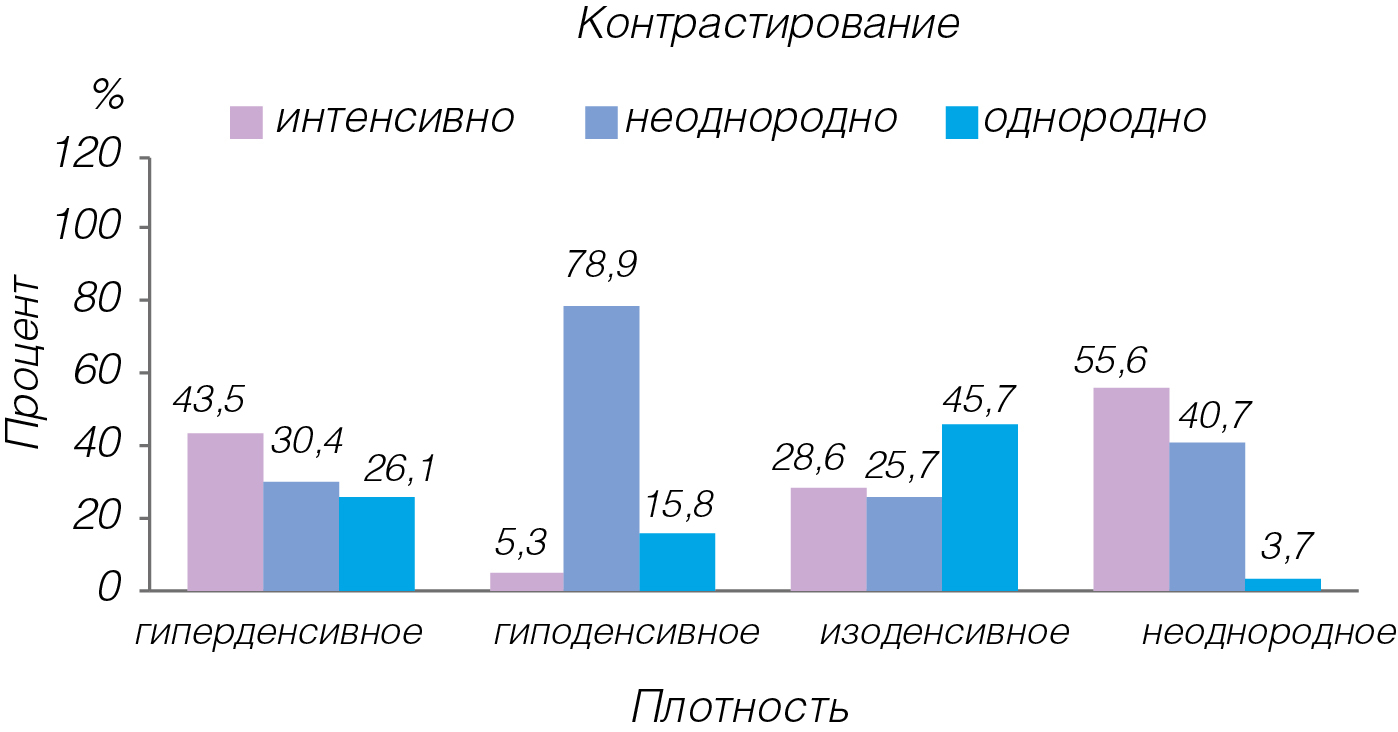 По результатам статистического анализа сравнения различных значений контрастирования по бинарным переменным выявлено различие групп по показателям VEGF более 95 пг/мл, таких значений больше в группе интенсивного контрастирования, значительно меньше – в группе неоднородного и еще меньше – в группе однородного. Также выявлено, что признаков рака, выделенных на основании определения плотности на КТ, больше всего в группе неоднородного контрастирования, немногим меньше – в группе интенсивного и существенно, практически в 2 раза, меньше – в группе однородного, р<0,05.
