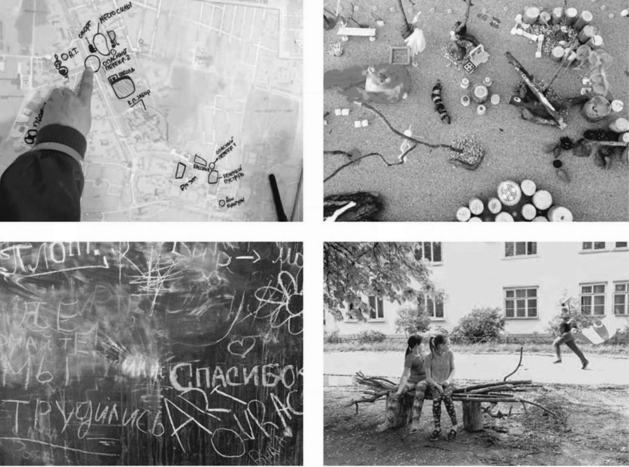 - Обследование и фиксация проблем территории и сигналов территориальности для выявления существующих границ неформальных владений и конфликтных зон на вторичной территории двора методом полевого исследования. Совместное обследование пользователями среды разного возраста позволяет понять потребности другой социальной категории, сформировать диалог внутри сообщества, понять его структуру и осознать в ней свое место.
