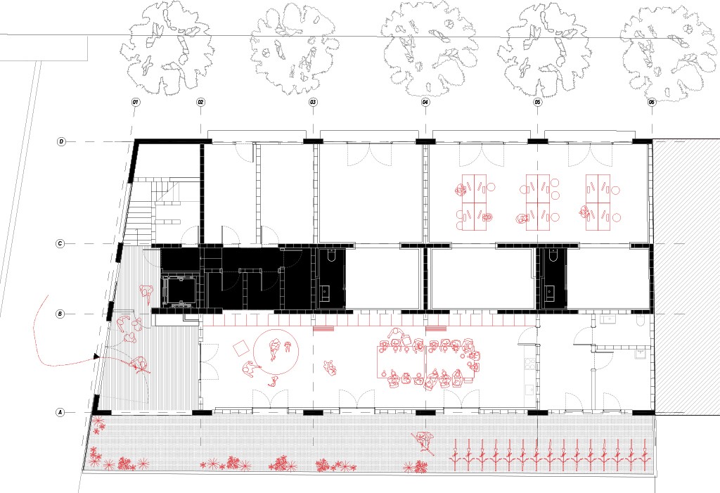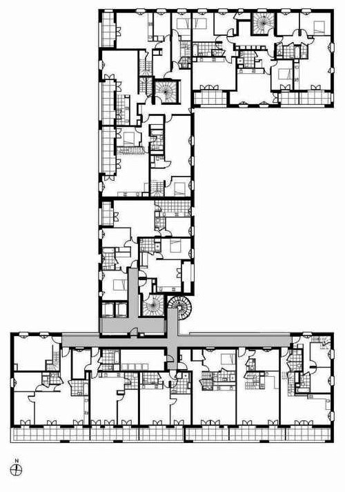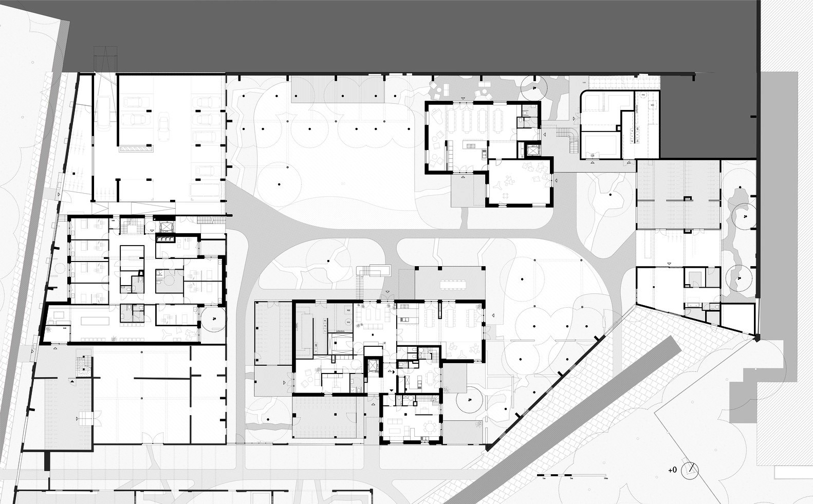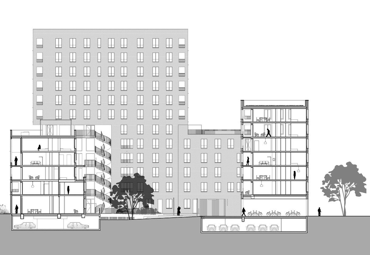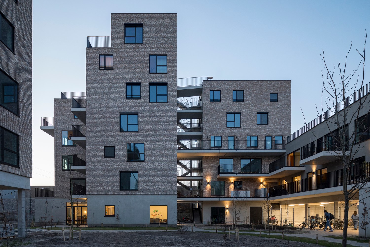Housing and Healthcare Center расположен в Бельгии. Строительство было завершено в 2022 г. Архитекторы: Bogdan & Vanbroeck. Заброшенную фабрику, располагающуюся в центре города, решили превратить в зону, включающую в себя 3 жилых блока с 59-ю жилыми ячейками, районный центр здоровья, цепь коллективных внутренних и наружных пространств, а также мастерская с видом на городской парк. Основное движение композиции задала треугольная форма промышленной площадки, которую решили оставить. Таким образом, она сохраняет атмосферу предыдущего объекта и сохраняет удивительную динамику формообразования в пределах городского квартала. Архитекторы выступили с инициативой обсудить со своими будущими жильцами возможное наполнение объекта и учли их пожелания, общение архитекторов и заказчиков принесло пользу каждой из сторон [7]. Каждый из трех жилых блоков имеет общественное пространство с общей кухней-столовой, гостиной, прачечной и детской игровой площадкой. Кроме того, есть тихие зоны: зимний сад и зона коворкинга (рис. 3).