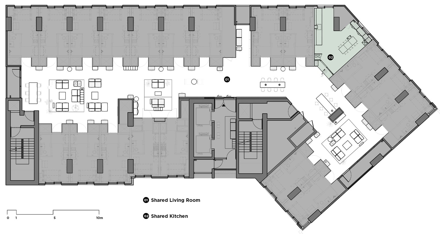 Первый этаж является общественным для всех жильцов, где можно найти просторную кухню-столовую, коворкинг (пространство для совместного труда), подсобные помещения и большой холл. Остальные этажи делятся на 4 ячейки с разными по площади квартирами, имеющие однокомнатные, двухкомнатные и трехкомнатные структуры [5].