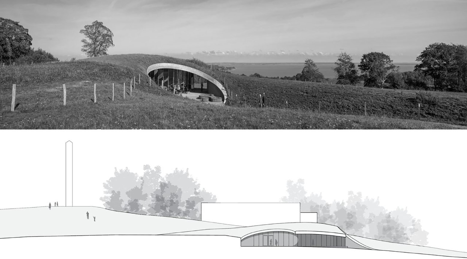 Не менее интересным примером архитектуры на склоне может служить Визит-центр Скамлингсбанкен (Skamlingsbanken) от архитектурного бюро CEBRA (рис. 2). Здание увидело свет в 2021 году, его площадь составила 500 м2. Архитектор описывает свой проект так: «Основная идея заключалась в том, чтобы сделать архитектуру частью общего ландшафта и быть как можно более тонкой» [3]. Сформировавшись в ледниковый период, холм Скамлингсбанкен был местом, где разворачивались важные для Дании исторические события. Визит-центр напоминает посетителям об истории страны и значении для неё этого места. Здание скрыто под зеленой крышей и напоминает холм, чтобы сосредоточить внимание на ландшафте. Вход в здание открывается изогнутым вырезом. В настоящее время в центре расположились учебные классы и медиа-пространства для проведения различных мероприятий, открыта выставка с постоянной экспозицией посвященной истории места и его природе, также имеются кафе с магазином. Конструкция центра для посетителей была отлита из бетона на месте. Благодаря монолитному железобетону удалось создать характерную пластику кровли, имитирующую естественный ландшафт, и заглубить здание под землю. Скамлингсбанкен расположен на самой высокой точке Южной Ютландии, где находятся старые пастбища с редкими растениями. Для сохранения и защиты флоры и фауны этого места и дальнейшего развития местного биоразнообразия в сотрудничестве с биологом Метте Кеселер был разработан проект озеленения крыши и склона на основе травяных покровов местных видов [4].