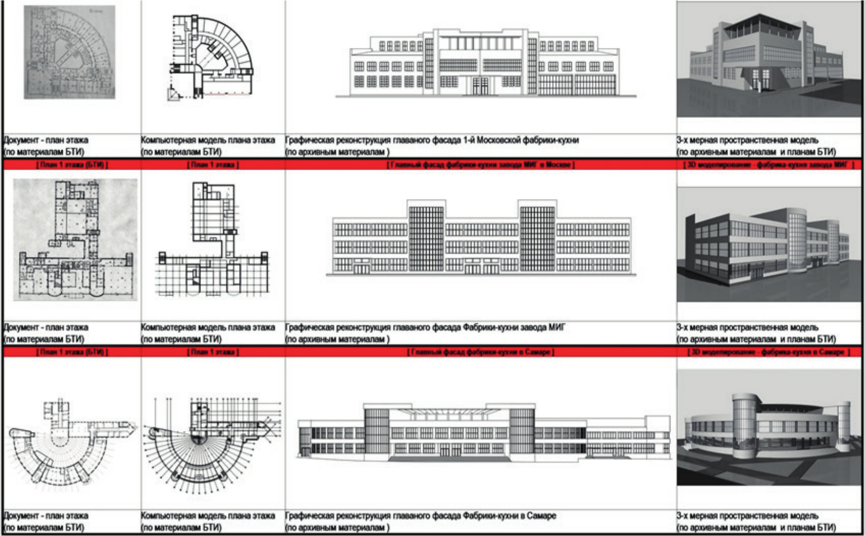Исследуются материалы по трем фабрикам-кухням, построенным в конце 1920-1930-х годов в городах Москве и Самаре. Проводится анализ архитектурно-планировочных структур следующих объектов: 1-й Московской фабрики-кухни (Ленинградский проспект, д.7), фабрики-кухни Государственного авиационного завода № 1 на улице 1-й Боткинский проезд, д.7 и фабрики-кухни завода им. Масленникова (ЗиМ) в Самаре (Ново-Садовая,149). Данные объекты до настоящего времени исчерпывающе не изучены и впервые рассмотрены в сравнении друг с другом, что позволило сделать некоторые выводы относительно их архитектурных особенностей и выявить преемственную связь в формообразовании. Особенностью их появления стал вновь обнаруженный факт, что в проектировании всех трех фабриках-кухонь принимала участие архитектор Максимова Екатерина Николаевна, ведущий архитектор паевого товарищества «НАРПИТ». В рамках статьи выясняется степень ее участия и выявляется эволюционная связь архитектурно-планировочных решений, завершившаяся строительством Самарской фабрики-кухни с символическим планом в виде Серпа и Молота. Изучается логика функционально-планировочных и технологических решений во взаимодействии с формой фабрик-кухонь и их архитектурным обликом. В статье описывается процесс моделирования объемных моделей фабрик-кухонь с применением новой методики выстраивания мерной линейки в 3D. На первом этапе проводилась фотофиксация фабрики-кухни с мерной линейкой со шкалой 10 см и далее, с помощью компьютера, эта линейка встраивалась в трехмерную модель.