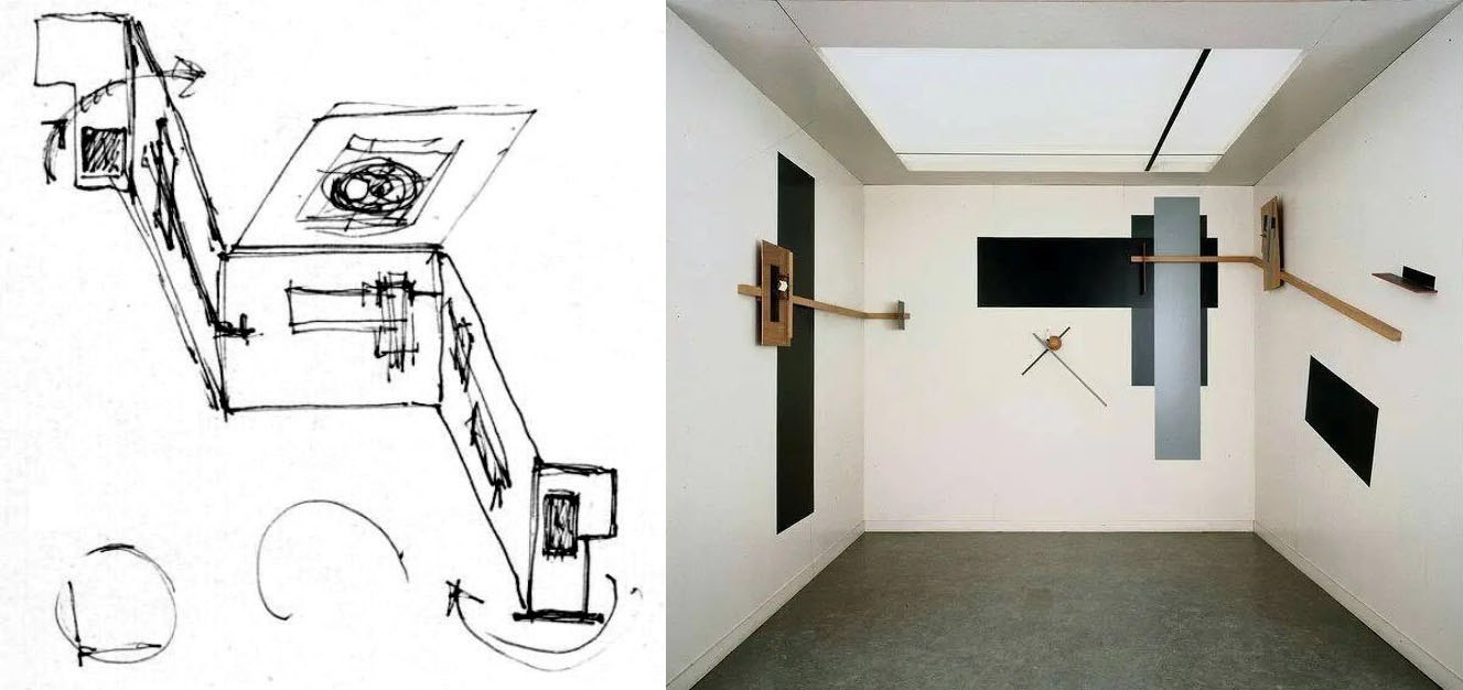 В 1923 году для Большой Художественной выставки в Берлине Эль Лисицкий создал Комнату проунов, умело соединив известные к тому времени подходы Малевича и Татлина – супрематизм и контррельефы, а также практики дадаистов, применявших такого рода эксперименты с выходом объектов из двухмерного в трехмерное пространство (рис. 1).