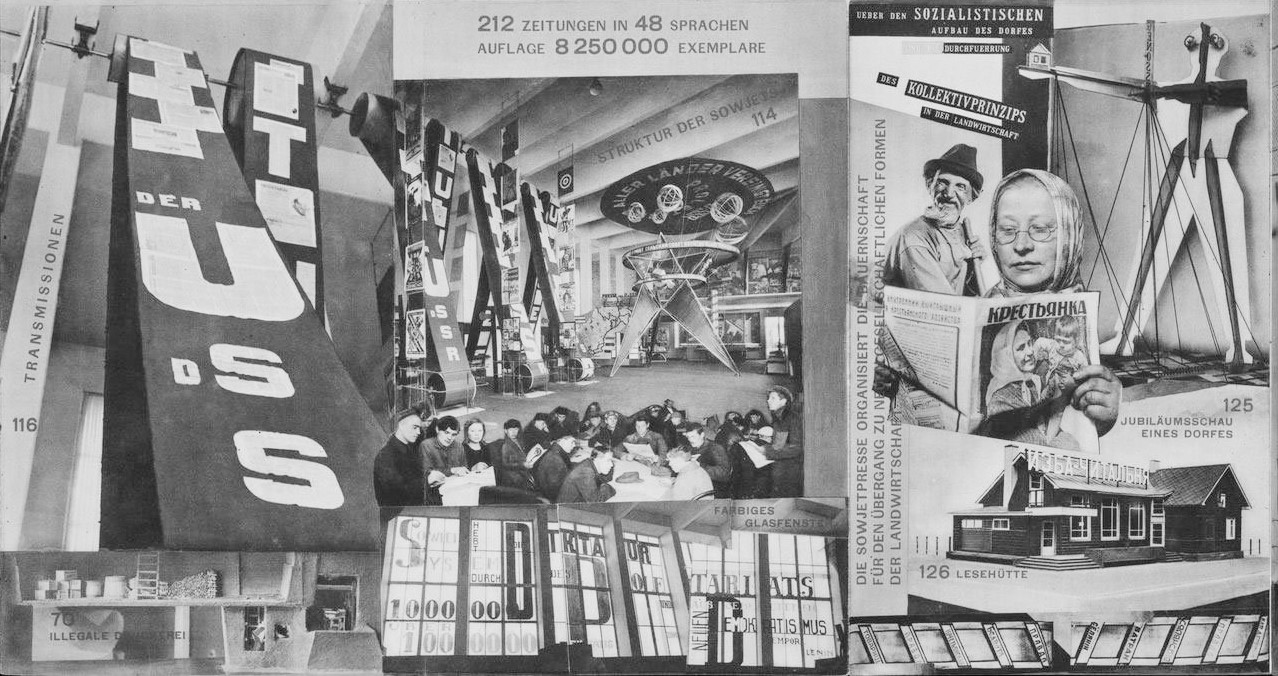 В 1928 году в Кельне для международной выставки «Пресса», для оформления экспозиции были приглашены Эль Лисицкий и Исаак Моисеевич Рабинович. В проекте благодаря внедрению четырех объемных светящихся букв «USSR» в четыре арки на фасаде, удалось добиться эффекта радикального преобразования псевдоклассического здания. Во внутреннем пространстве были асимметрично проложены специально созданные динамичные конструкции-аттракционы, игравшие роль маяков и задававшие маршрут для зрителей: «Звезда», «Рабочий корреспондент», «Красная Армия», «Трансмиссия». Кроме того, что здесь впервые были использованы движущиеся установки, нововведением стало применение крупноформатного фотомонтажа и использование света как средства выразительности (рис. 3). Зрелище было впечатляющим: бесконечное движение ленты с надписями «USSR» создавало художественный образ вечного конвейера [6, 7].