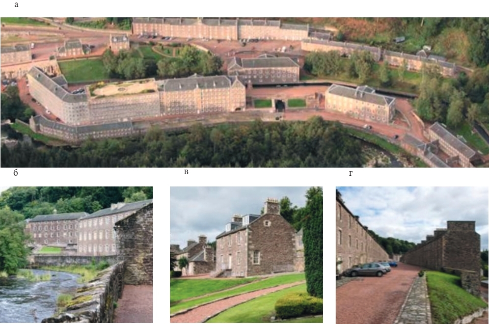 Будучи гуманистом, Р. Оуэн был убеждён в том, что для увеличения производительности труда владельцы предприятий должны заботиться о своих работниках, создавая им достойные условия жизни. Таким альтруистом оказался владелец фабрики в Нью-Ланарке – Дэвид Дейл, ставший тестем Р. Оуэна. Строительство фабричного посёлка велось по специальному проекту, в котором было предусмотрено не только удобное и хорошо оборудованное арендное жильё, но также и общественные здания, необходимые для удовлетворения физических и духовных потребностей трудящихся (рис. 1а). При проектировании использовались лучшие стандарты того времени. Когда в посёлке были построены первые жилые дома, каждой семье предоставлялась жилая ячейка – отдельная комната. Но некоторые из них находились в подвале. Со временем обстоятельства позволили увеличить жилые ячейки до двух и более комнат, а подвальные помещения были переоборудованы под прачечные. Планировка жилых зданий и их размеры в Нью-Ланарке были разными. Возможности ограничивались орографическими условиями: местность здесь довольно пересечённая. Форма и площадь участков была связана с параметрами подходящих площадок: Double Row – самый широкий из многоквартирных домов, Long Row – самый длинный. Было построено несколько коттеджей для управленческого персонала, из которых два сохранились до наших дней. Они известны сегодня как дом Роберта Оуэна и дом Дэвида Дейла. Текстильная фабрика проработала в Нью-Ланарке до 1968 г., а посёлок на протяжении почти 200 лет служил наглядным примером создания образцового промышленного поселения. Все здания были построены в едином стиле (рис. 1б, 1в, 1г). Стены добротных многоквартирных жилых домов, построенных на узких террасах пересечённого рельефа, были выполнены из песчаника, крыши – из шотландского шифера. Считается, что гуманная среда, созданная в этом поселении, стала прототипом городов-садов, концепцию которых на рубеже XIX и XX веков выдвинул Эбенизер Говард [5].
